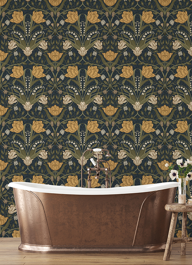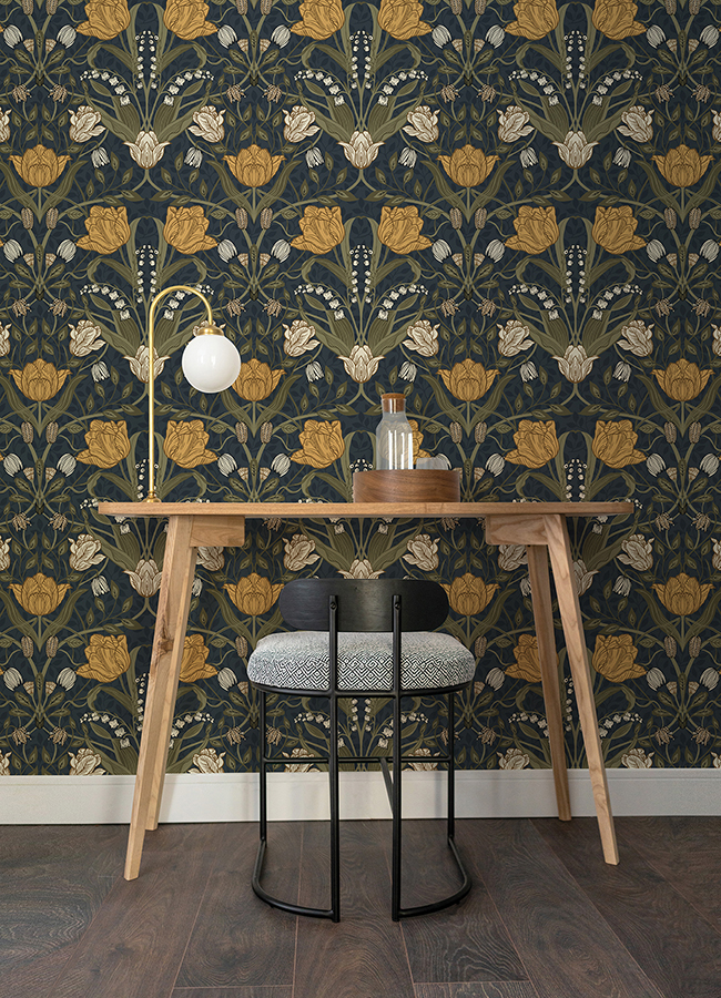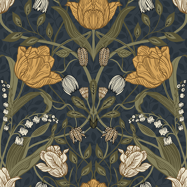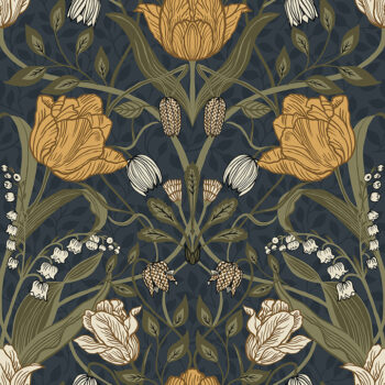 Create a bold and beautiful tulip-filled room with this floral wallpaper. The white and golden tulips are striking against a navy blue backdrop imprinted with a delicate vine design. Filippa is an unpasted, non woven wallpaper.