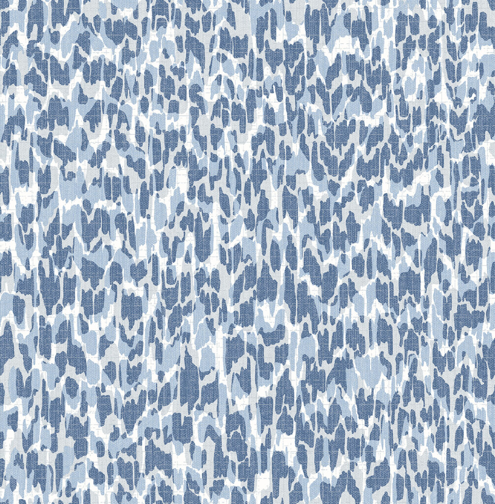 Animal print enjoys an elevated makeover with this wallpaper. Shades of blue accented with raised inks form an array of organic spots along a white backdrop. Flavia is an unpasted, non woven wallpaper.