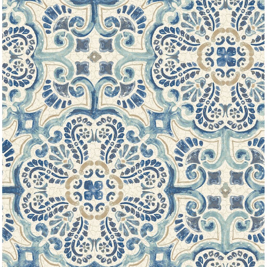 A stunning Moroccan pattern with a Florentine flair. The blue and taupe design appears hand-painted onto a crackled surface in pearlescent ivory. Printed in a large-scale, this wallpaper’s vintage tile look is given a modern update.