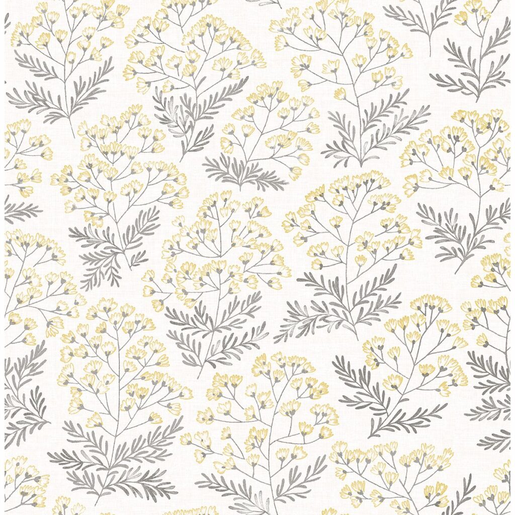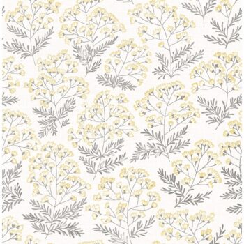 Grey sprigs with delicate yellow flowers twirl about a linen inspired background in this cheerful design. Its painterly style emphasizes its whimsical energy. Floret is an unpasted, non woven wallpaper.
