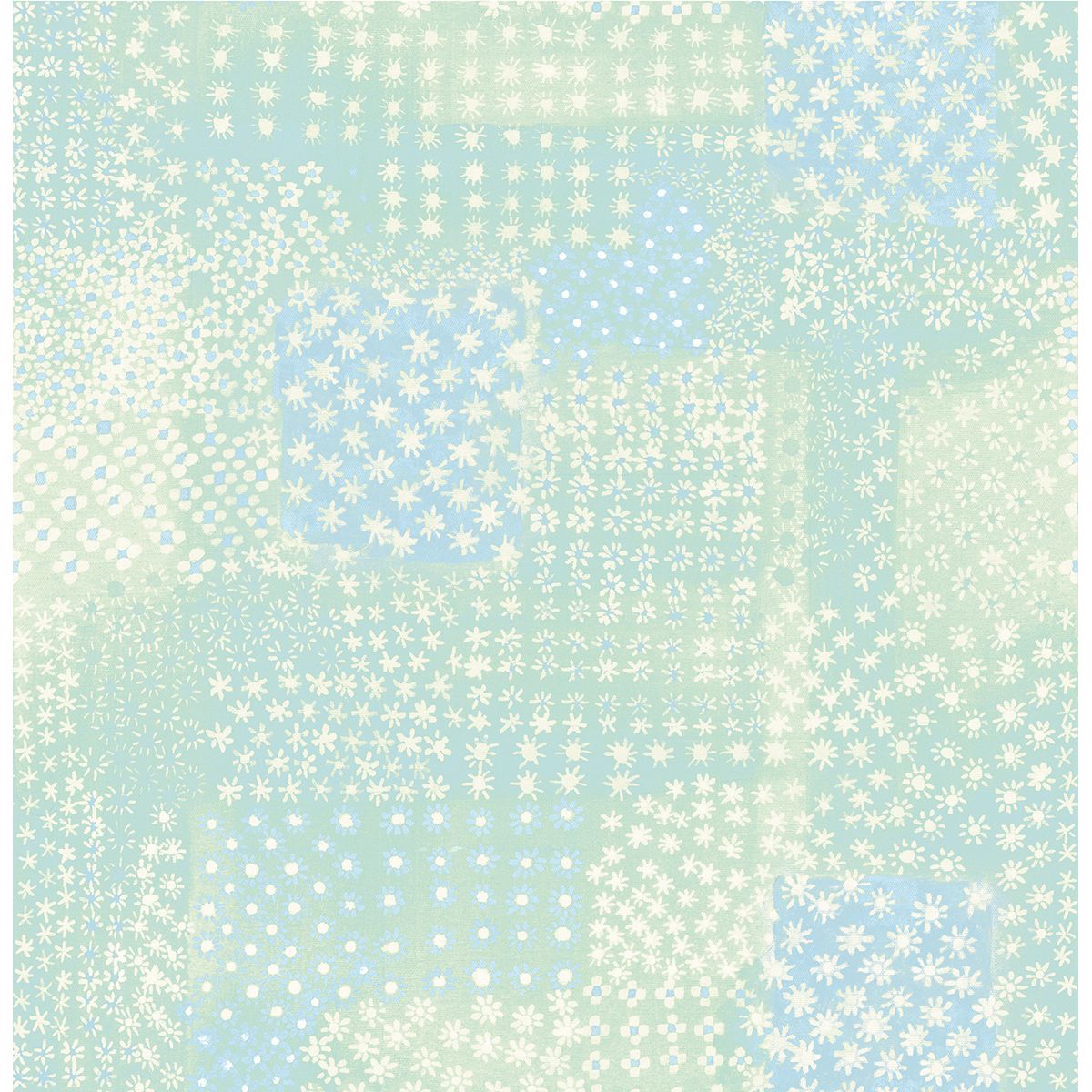 A pretty mint and pastel blue are arranged in a lively patchwork print. This delightful wallpaper shimmers ever so delicately while happy florals add an invigorating and fun touch.