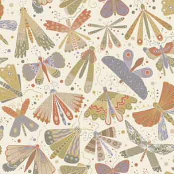 Surround yourself with sweet, summertime nostalgia with this magical moth wallpaper. The array of butterflies, moths, and other winged critters are decorated in shades of green, coral, periwinkle, and gold. Flyga is an unpasted, non woven wallpaper.