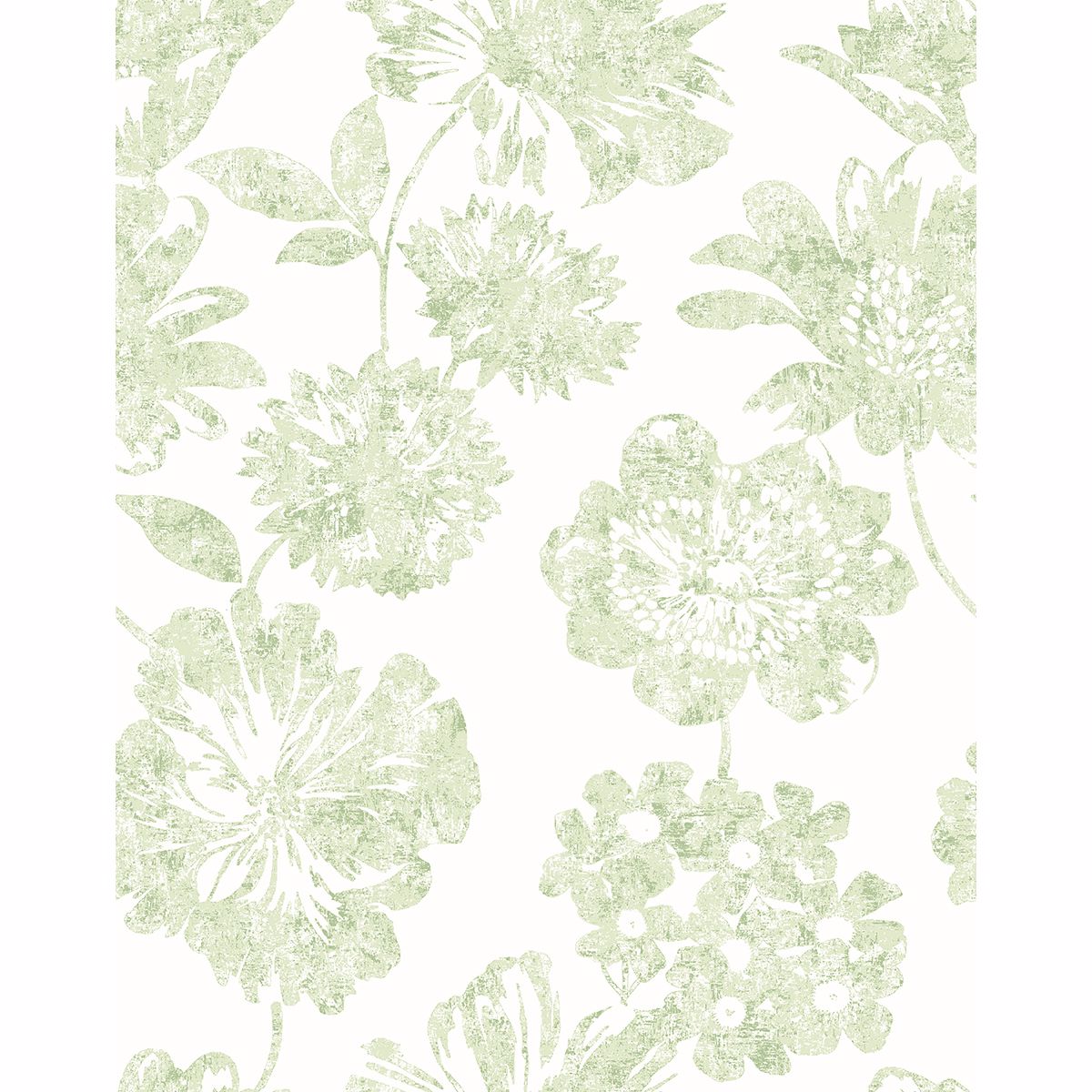 With a distressed design, this floral wallpaper has a lovingly weathered style. Its light green botanical pattern pops against a crisp white background. Folia is an unpasted, non woven wallpaper.