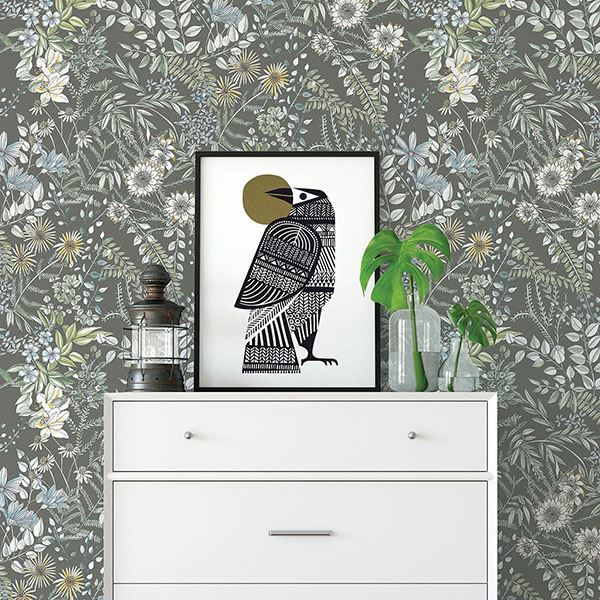 Fresh from a luscious garden, forest flowers blossom against a rich taupe background in this earthy wallpaper. Deep blue, sage green, and mustard hues emphasize its organic style, while its watercolor design adds a whimsical flair. Full Bloom is an unpasted, non woven wallpaper.