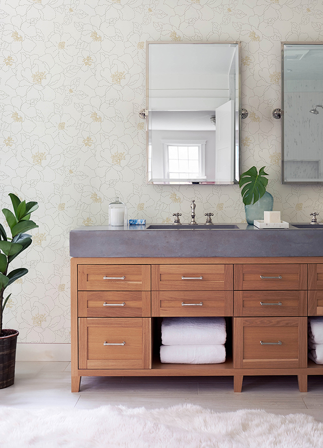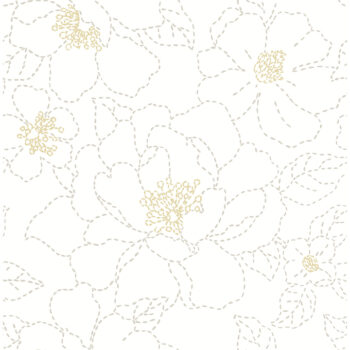 This floral wallpaper is a compelling case for less is more. Lush blossoms are outlined with simple grey stitches against the white backdrop, the flowers’ centers embellished with metallic gold ink. Gardena is an unpasted, non woven wallpaper measuring 20.5 inches wide by 33 feet long, covering approximately 56.4 square feet per roll.