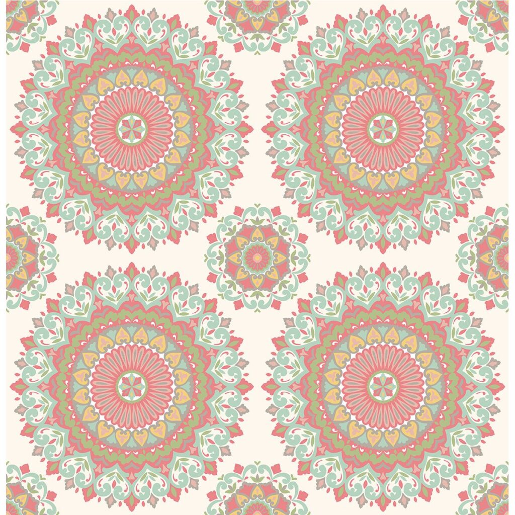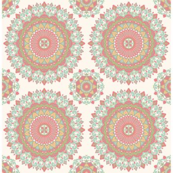 Colorful medallions radiate enthusiasm and charisma on this stunning wallcovering. A fresh coral and aqua palette invite a vibrancy to your space, bringing a free-spirited punch to décor.