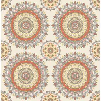 Beautiful coral, grey and yellow medallions create a fascinating kaleidoscope effect on walls. Evocative of the romantic suzani fabrics of Central Asia and the Middle East, this bohemian chic wallpaper enchants with brilliant bursts of color and a gorgeous global look.