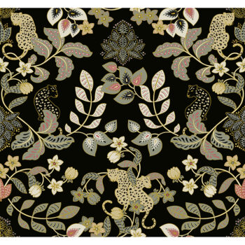 Enliven your interiors with a rich dose of bohemian glamour. This modern damask wallpaper features lounging leopards framed by lush floral vines, the golden yellow, cream, pink, and sage detailing even more striking against an ink black background. Getty is an unpasted, non woven wallpaper measuring 27 inches wide by 27 feet long, covering approxiamately About 60.8 square feet square feet per roll