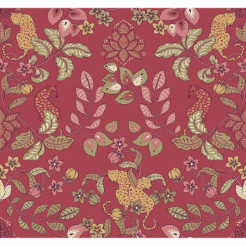 Bring untamed sophistication to your interiors with this modern damask wallpaper. Leopards sit in repose surrounded by lush floral vines, a palette of rich raspberry, pink, and golden yellows adding to its dramatic flair. Getty is an unpasted, non woven wallpaper measuring 27 inches wide by 27 feet long, covering approxiamately About 60.8 square feet square feet per roll