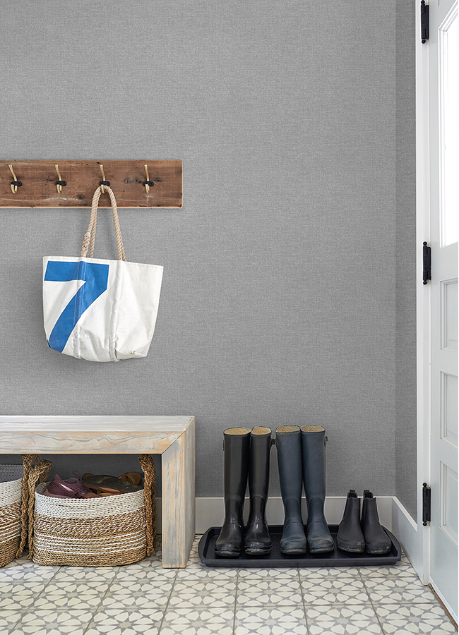 Add a hint of stormy sophistication to your walls with this faux linen design. The rich grey and white surface is layered with raised inks and a pearlescent finish, elevating this wallpaper with subtle sheen and texture. Glen is an unpasted, non woven wallpaper.