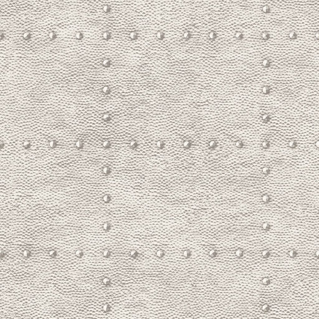 Embrace the upcycle trend with this faux metal wallpaper. A hammered inspired texture and rivets create a dimensional look while its glistening ivory hue will make walls shine. Goldberg is an unpasted, non woven wallpaper.