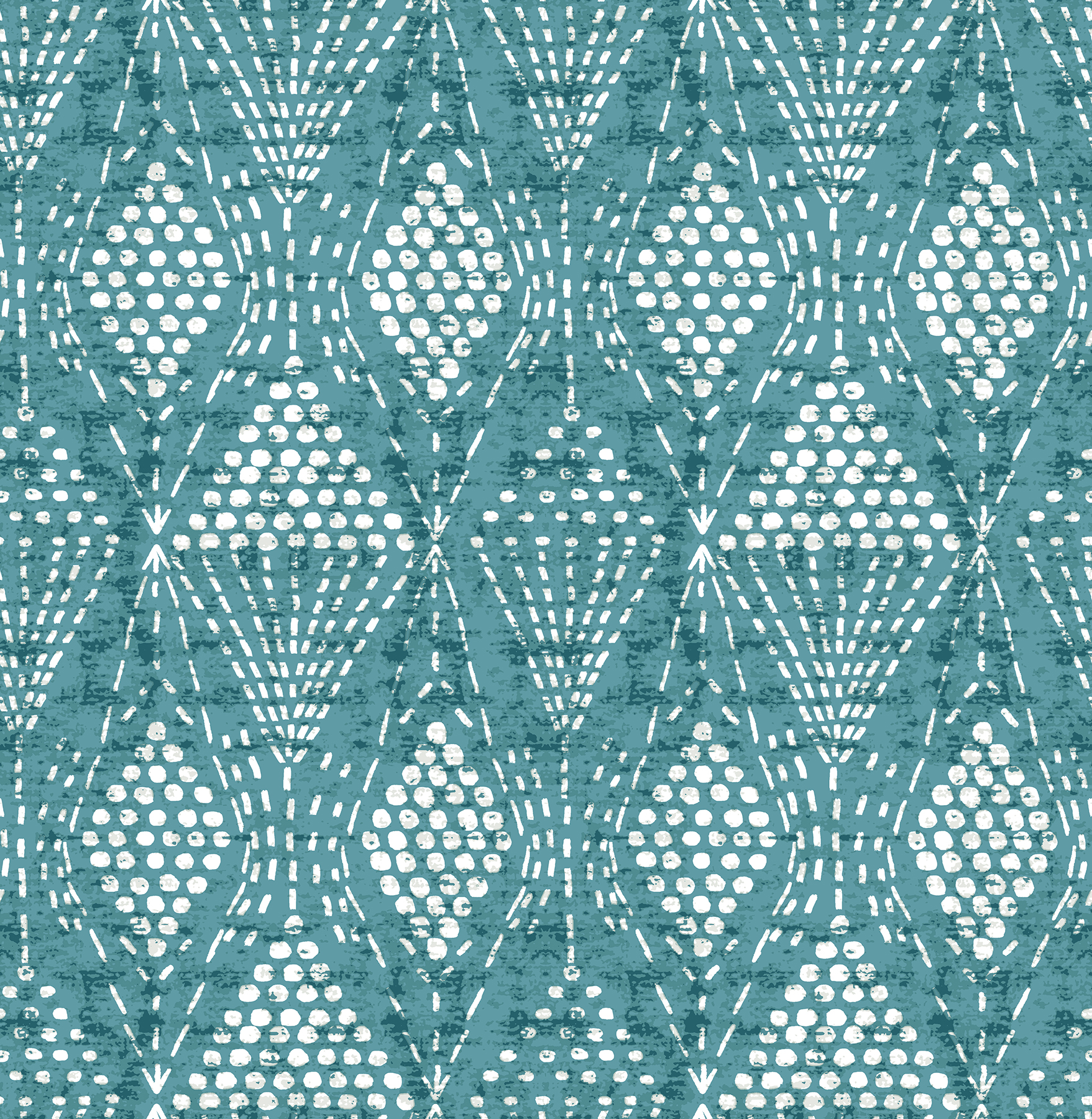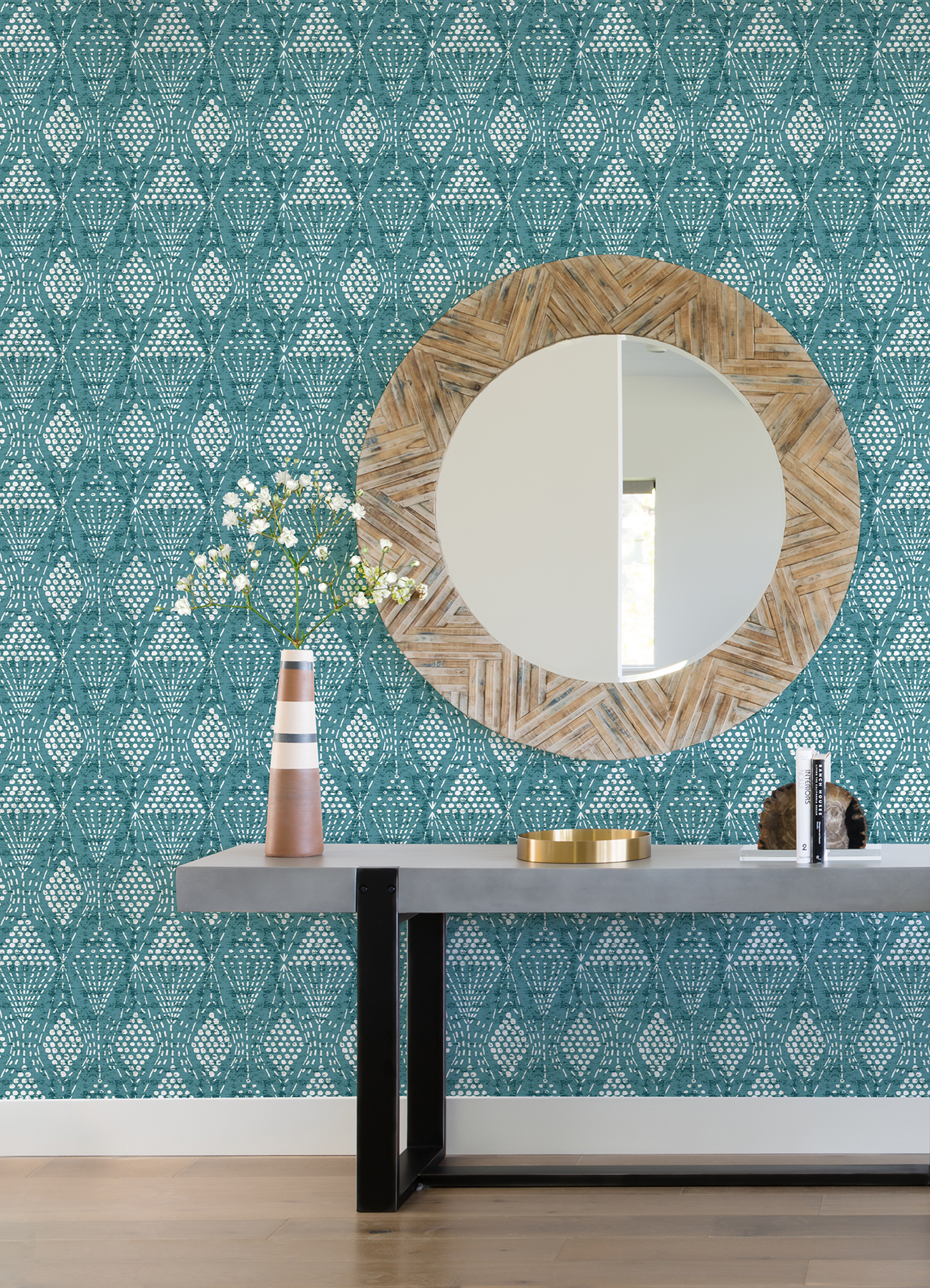 This geometric wallpaper will bring polished, bohemian energy to your interiors. The teal tie-dye backdrop highlights the white, dotted diamond pattern accented by raised inks. Grady is an unpasted, non woven wallpaper.
