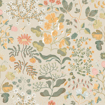 Enjoy the sweetness of summertime with this Scandinavian-inspired floral wallpaper. The wildflower blossoms visited by bumbling bees and moths are inked in apricot, teal, coral, light bye, and muted chartreuse along a pale grey backdrop. Groh is an unpasted, non woven wallpaper measuring 20.9 inches wide by 33 feet long, covering approxiamately About 57.5 square feet square feet per roll