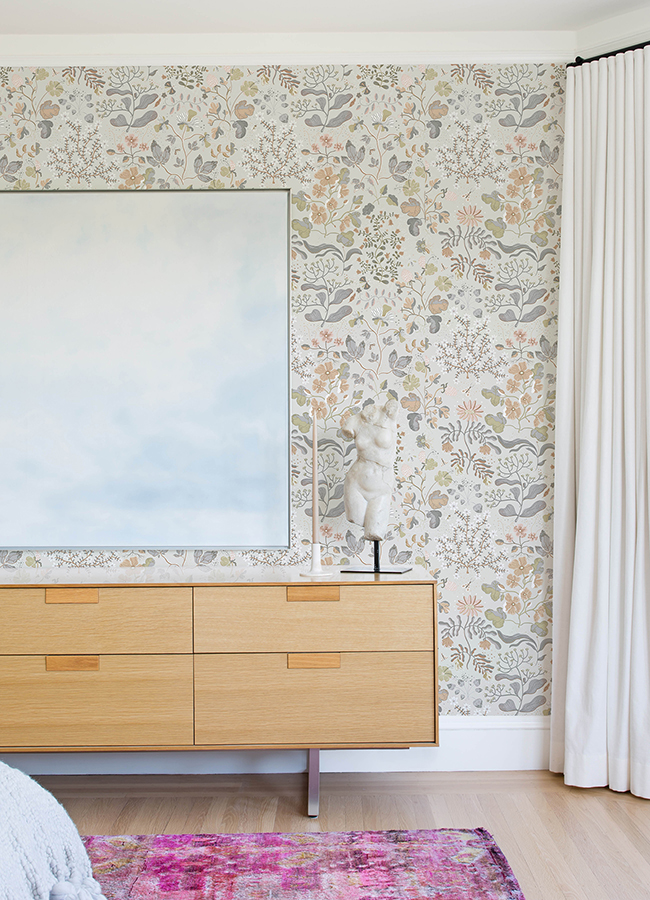 This Scandinavian-inspired floral design is bursting with summertime sweetness. A more muted version of Groh Apricot, this colorway features muted pastel hues in shades of peach, pink, blue, and green against a pale grey background. Groh is an unpasted, non woven wallpaper measuring 20.9 inches wide by 33 feet long, covering approxiamately About 57.5 square feet square feet per roll