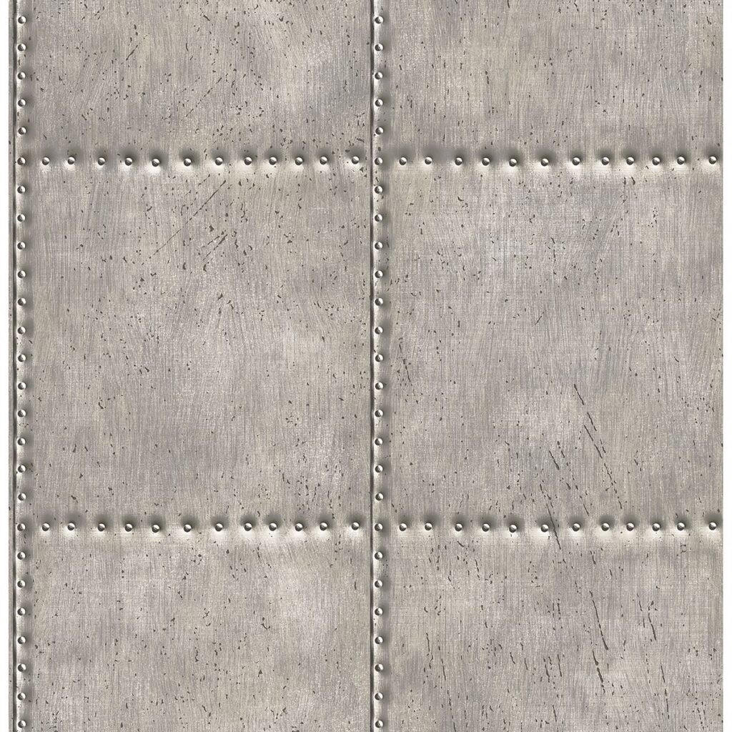 Perfect for creating an industrial chic look, this wallpaper is made to resemble sheet metal. Riveted accents add a dimensional touch to its brushed silver design. Hale is an unpasted, non woven wallpaper.