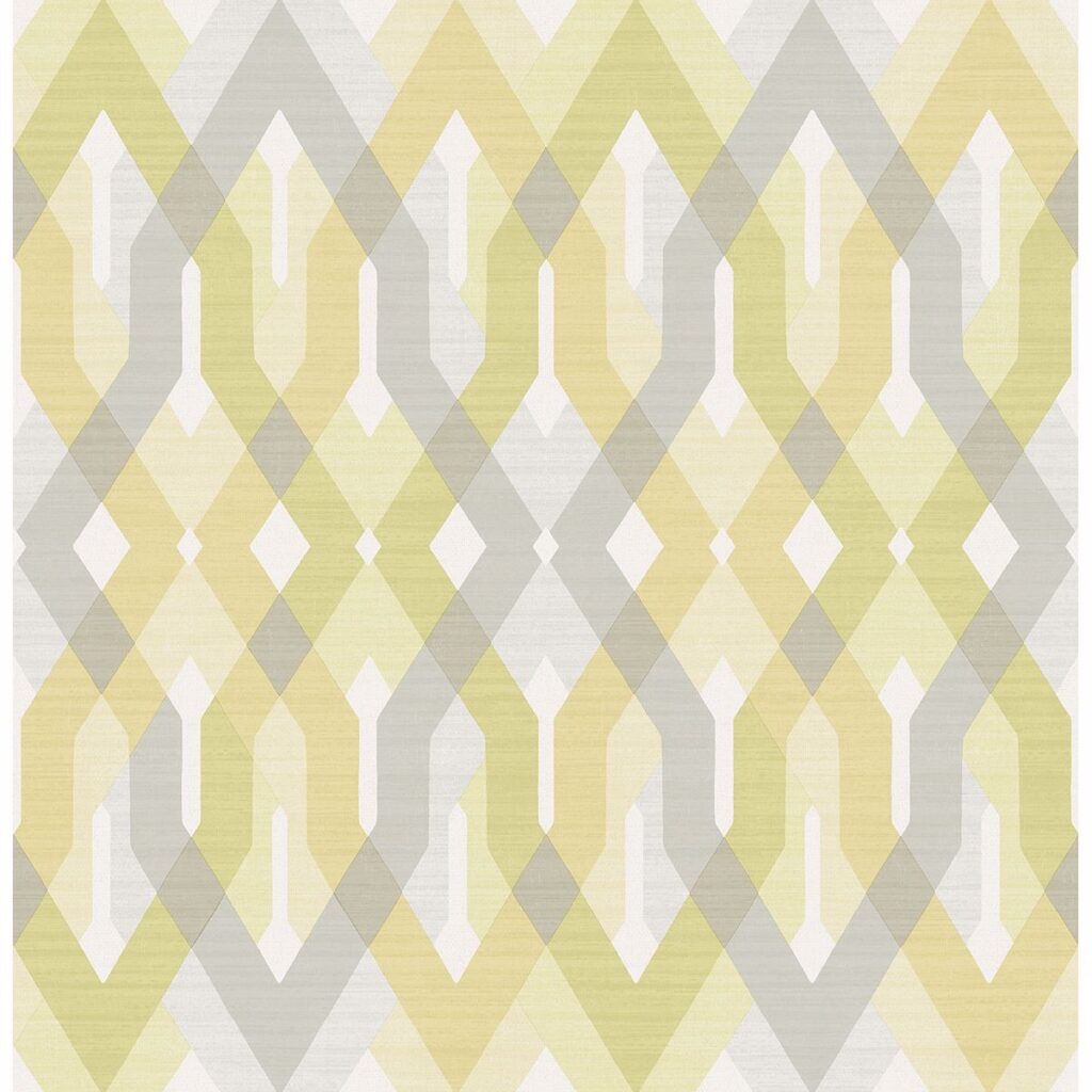 Cool greys contrast with warm yellows and greens in this lattice wallpaper. A texture effect background with a semi-sheer overlay make for a modern take on a classic design.