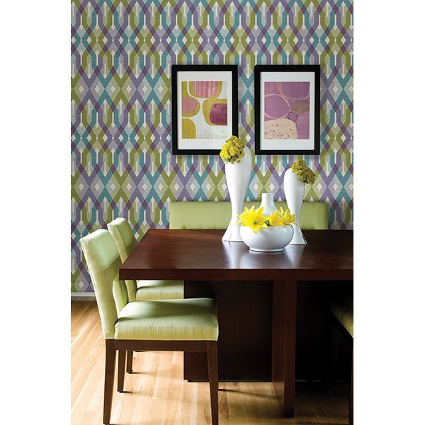 Vibrant shades of emerald, teal, and plum make for a boldly saturated diamond print wallpaper. The geometric design adds a modern element to this classic color palette.