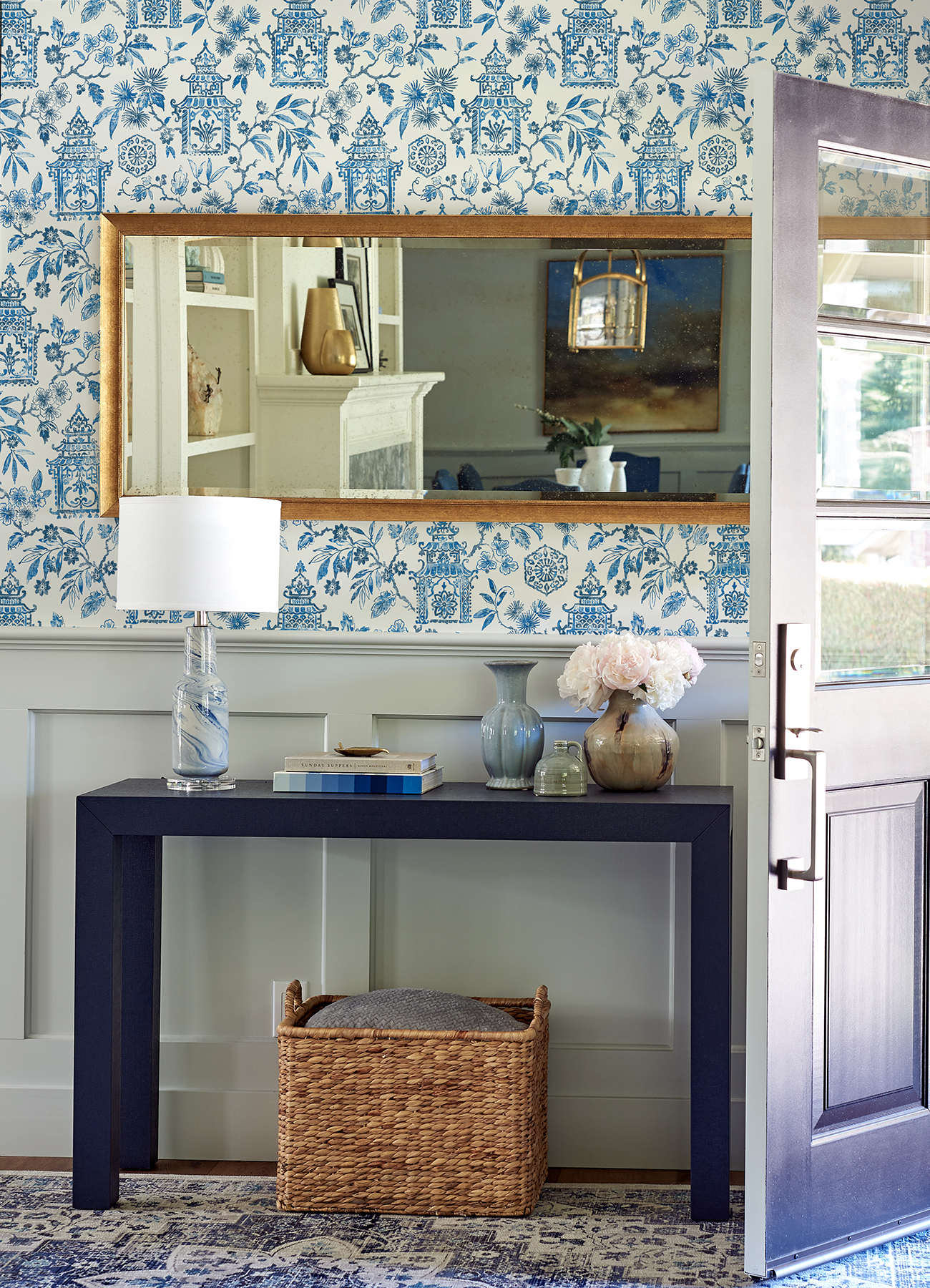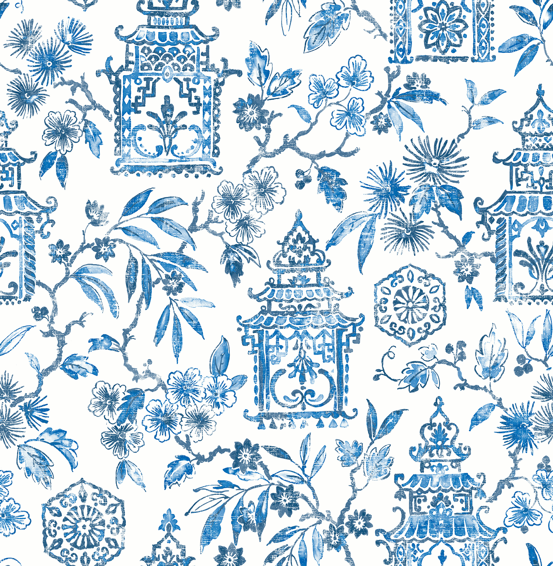 Bring playful sophistication to your walls with this chinoiserie-inspired design! This toile wallpaper features petite pagodas, floral medallions, and blossoming fruit tree branches, all inked in shades of blue against soft white. Helaine is an unpasted, non woven wallpaper.