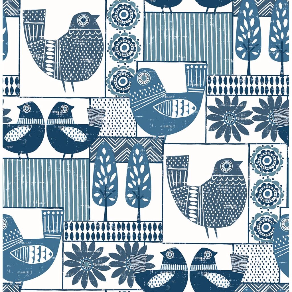 Add life to your walls with this blue Scandinavian design. Featuring charming birds, beautiful flowers, and graceful trees, this patchwork wallcovering has a folk style. Hennika is an unpasted, non woven wallpaper.