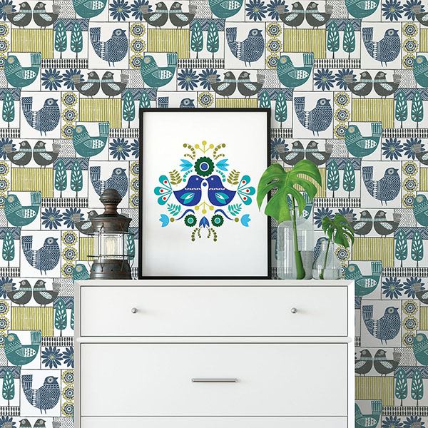 Create an inviting feel with this patchwork of charming birds, graceful flowers and delightful trees. Its brown, blue and olive hues emphasize its nature inspired design, while distressed details add a weathered touch. Hennika is an unpasted, non woven wallpaper.