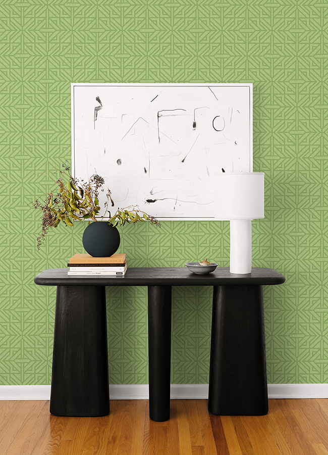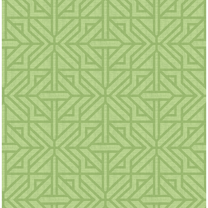 Fresh yet timeless, this verdant geometric design is an instant refresh for your walls! Ornate linework is inked in green along a lighter green, faux linen backdrop. Hesper is an unpasted, non woven wallpaper.