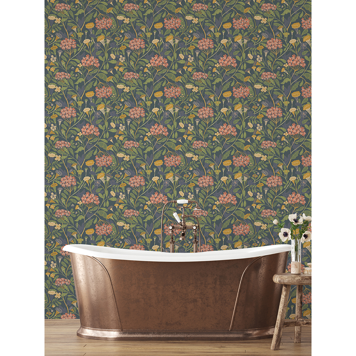 Take a stroll through a charming flower garden with this illustrative wallpaper. Pink hydrangeas sprout upwards alongside blue, gold and green trumpet flowers, the botanicals all offset by a dotted blue backdrop. Hybbe is an unpasted, non woven wallpaper.