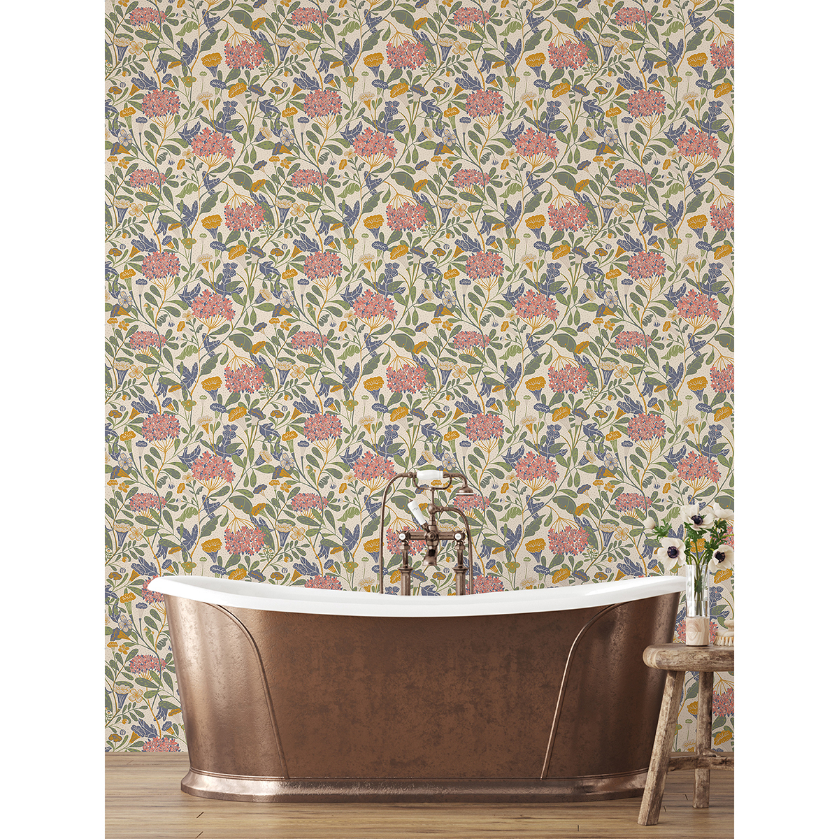 Enjoy summertime blooms year-round with this illustrative floral wallpaper. Pink hydrangeas and blue, gold, and green trumpet vine wind up towards the sun against a dotted off-white background. Hybbe is an unpasted, non woven wallpaper.