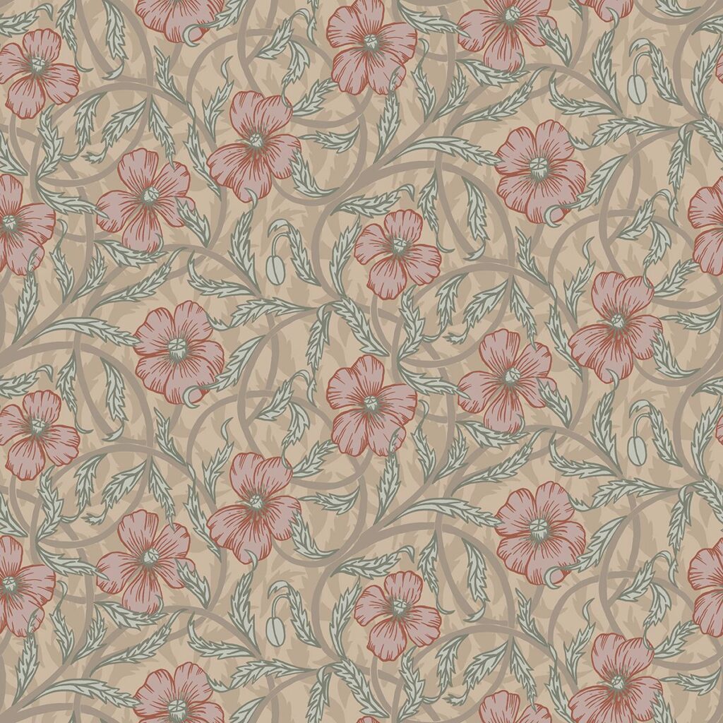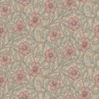 Ornate and beautiful, this eclectic wallpaper features blossoming flowers amongst curling geometrics. Its palette of beige, light brown and muted red emphasize its organic energy. Imogen is an unpasted, non woven wallpaper.
