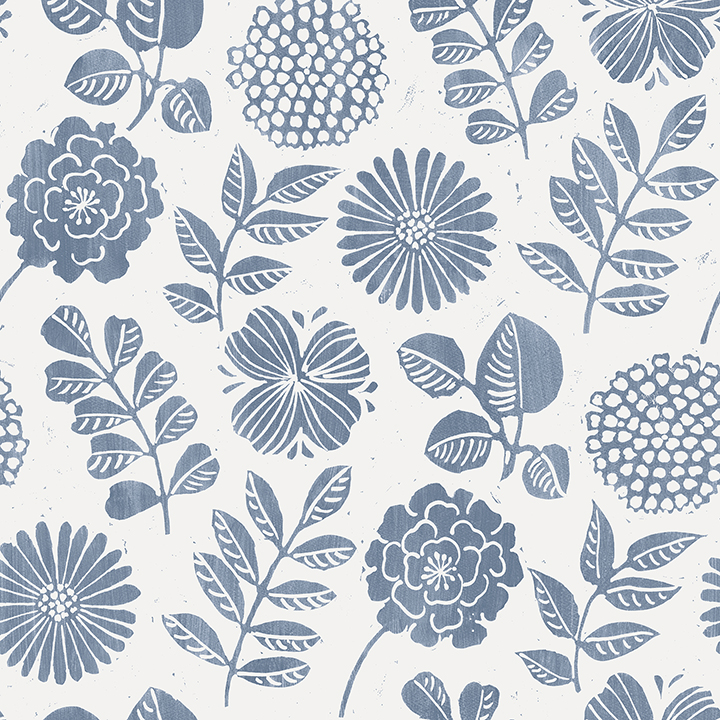 This botanical wallpaper is bursting with artistic simplicity and woodland beauty. A variety of flowers and leaves are block-printed in denim blue inks against crisp white. Inge is an unpasted, non woven wallpaper.