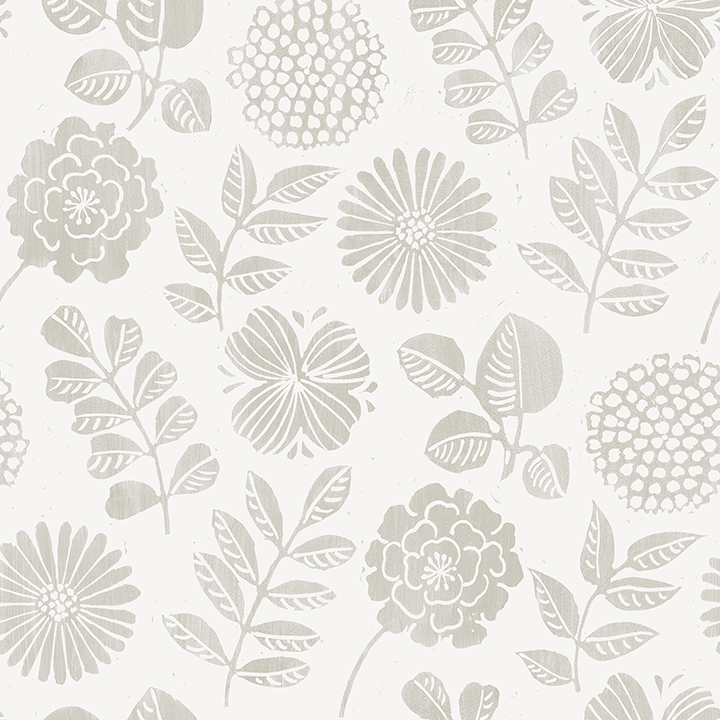 This whimsical woodland wallpaper will bring artistic charm to your interiors. A variety of simple flowers and leaf block prints are inked in delicate grey on white. Inge is an unpasted, non woven wallpaper.