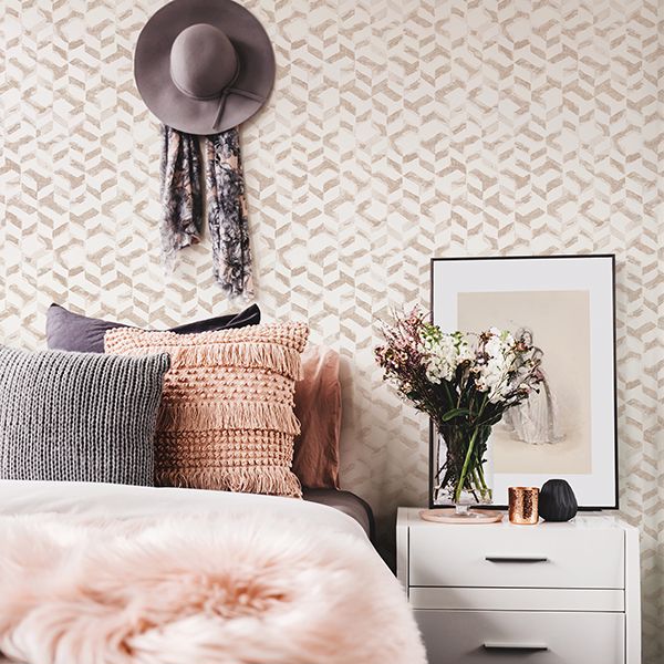 Featuring a dazzling geometric print, this linen inspired design is perfect for creating a textural effect. Rose gold accents and distressed details combine for a shabby chic look. Instep is an unpasted, non woven wallpaper.