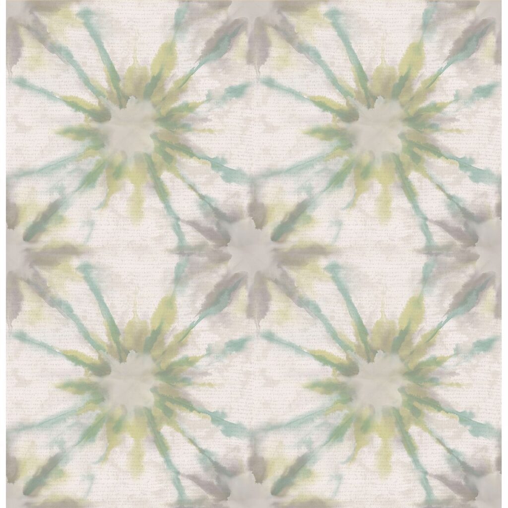 Tie-dyed starbursts collect atop a textured landscape for a truly fascinating wallpaper design. A dreamy blend of turquoise, green and grey captivate the senses for a unique and unexpected accent in any room.
