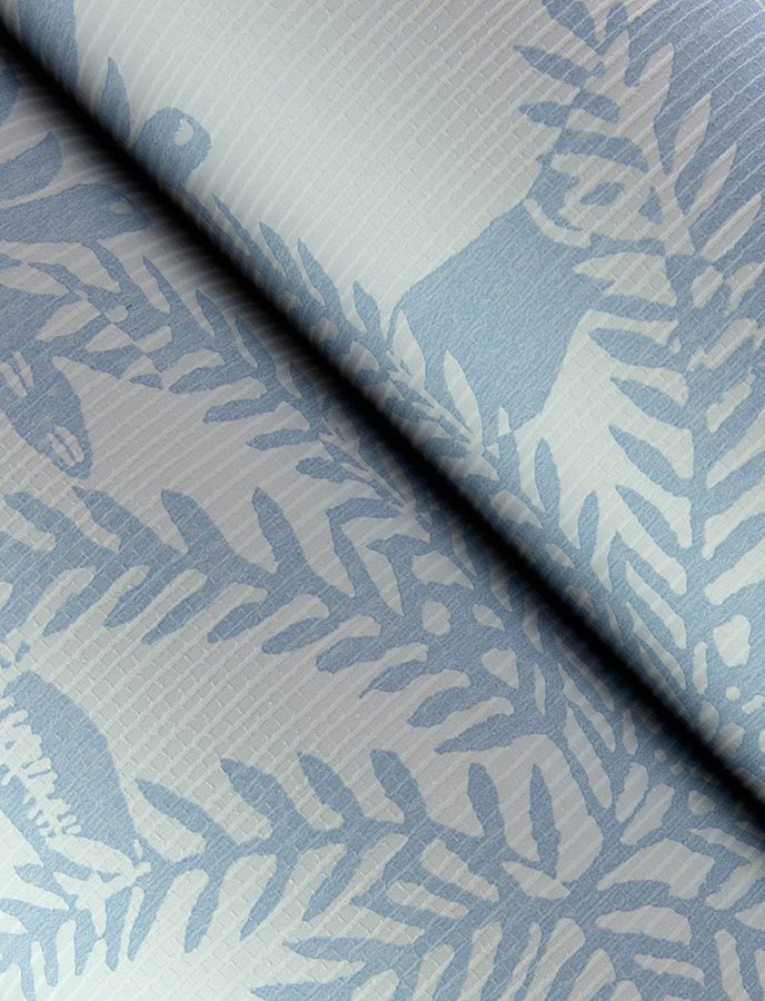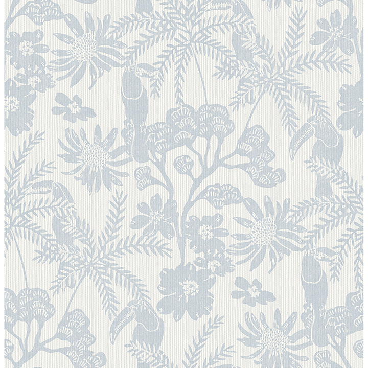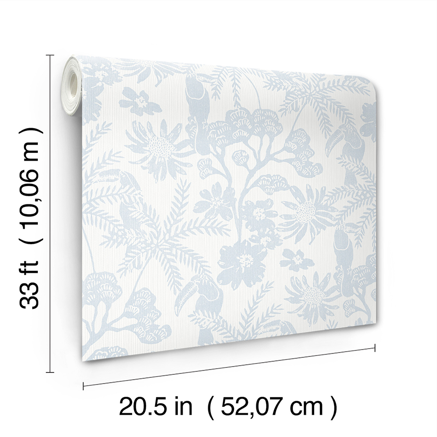 Enjoy a tropical take on classic trail wallpaper with this playful design. Toucans perch within the lush and winding rainforest flora, the details inked in periwinkle-blue along a pale grey background with a ridged texture. Jacaranda is an unpasted, non woven wallpaper measuring 20.5 inches wide by 33 feet long, covering approximately 56.4 square feet per roll.