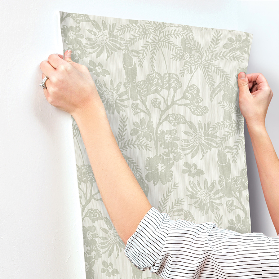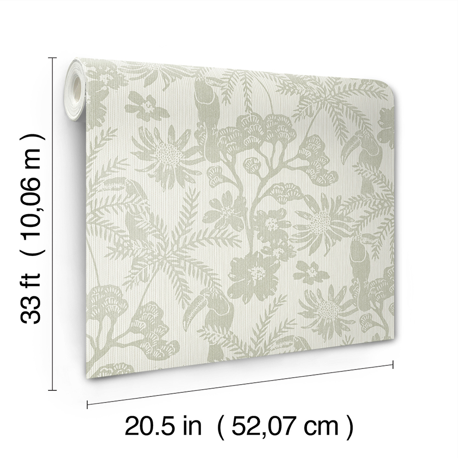 Enjoy a tropical take on classic trail wallpaper with this playful design. Toucans perch within the lush and winding rainforest flora, the details inked in delicate sage along a pale g+Q50rey background with a ridged texture. Jacaranda is an unpasted, non woven wallpaper measuring 20.5 inches wide by 33 feet long, covering approximately 56.4 square feet per roll.
