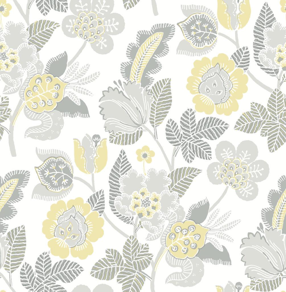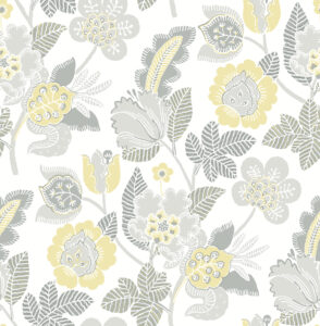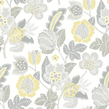 The classic sophistication of Jacobean florals has been updated in this chic wallpaper. The floral trails are inked in shades of light grey and soft yellow, the shapes embellished with white detailing that matches the backdrop. Jana is an unpasted, non woven wallpaper.