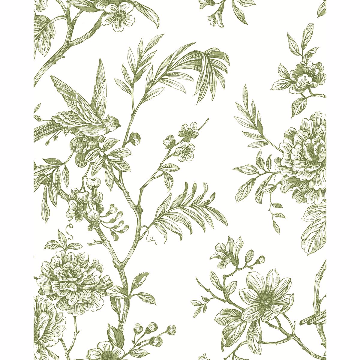 This wallpaper adds a punch of organic color to walls. The green trail pattern’s flowers and birds are delicately detailed. Jessamine is a non woven, unpasted wallpaper.