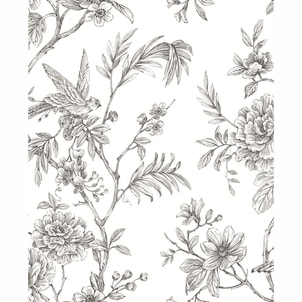 This large-scale trail wallpaper is enchanting and beautiful. The monochromatic color scheme makes the floral and bird design versatile. Jessamine is a non woven, unpasted wallpaper.