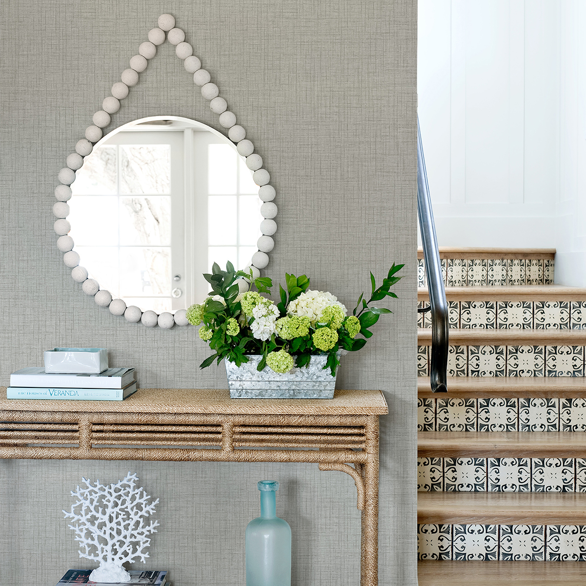 This faux fabric wallpaper is a blend of light greys streaked with darker hues. To further the illusion, raised inks give the wallpaper a woven texture. Jocelyn is an unpasted, non woven wallpaper.