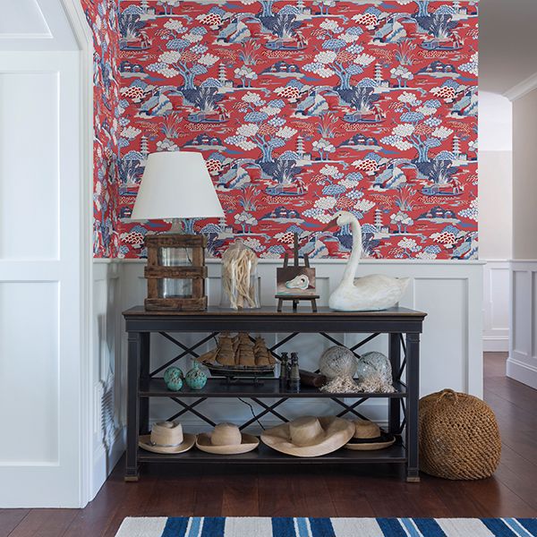 Filled with bridges, pagodas, and fishing boats, this toile design depicts a lush landscape. Its palette of bold red, blue and grey hues is perfect for incorporating color into your décor. Joy De Vie is an unpasted, non woven wallpaper.