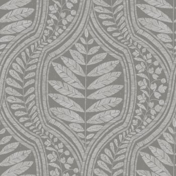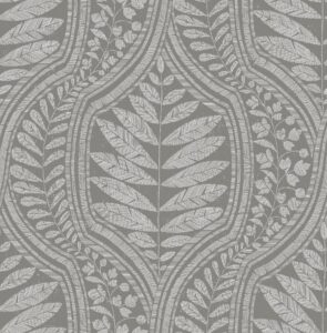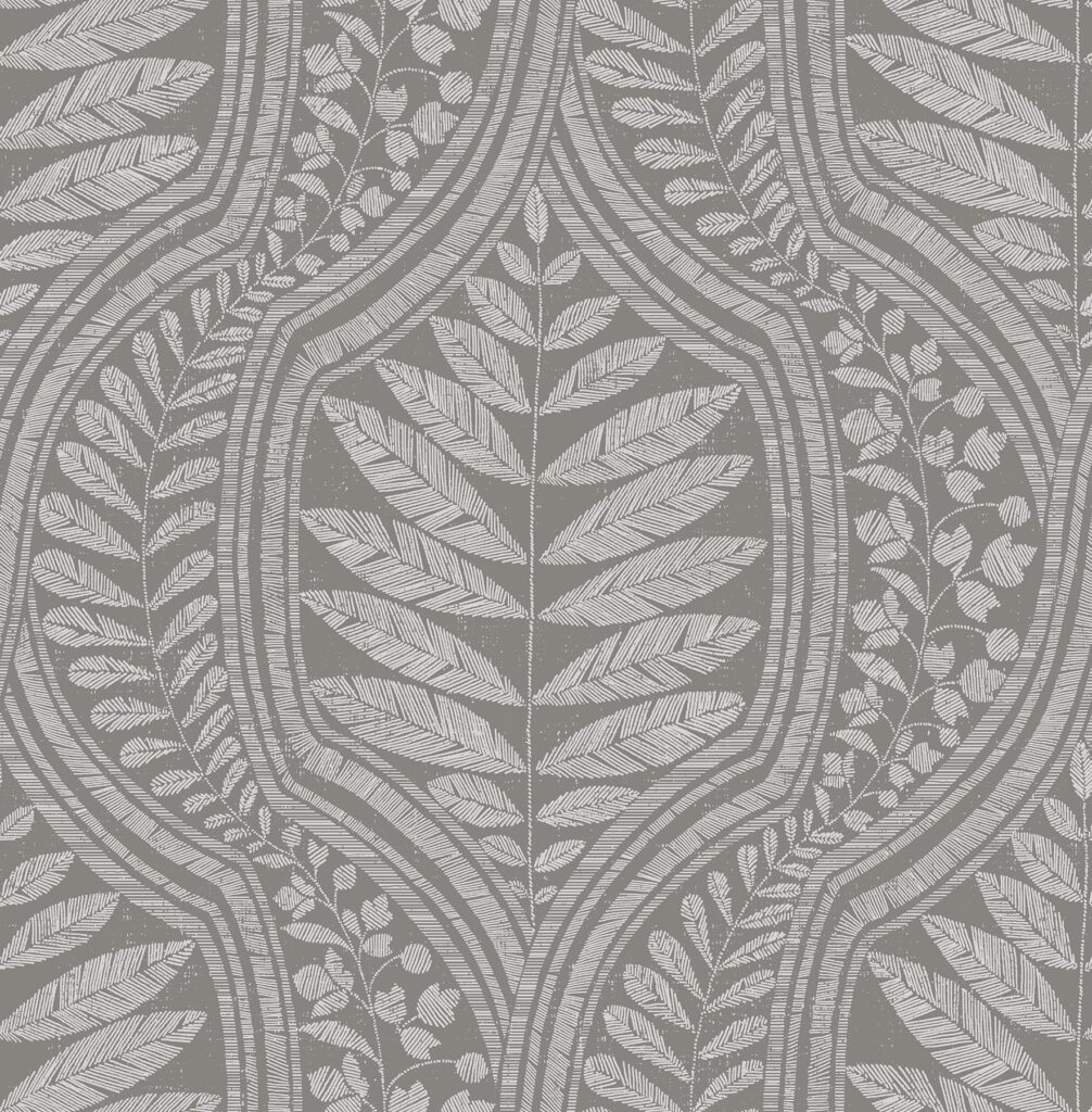Bohemian mixed with Scandinavian flair, this floral wallpaper features a charming ogee print amidst its leaf design. The grey and white color palette lends a calming ambiance. Juno is an unpasted, non-woven wallpaper.