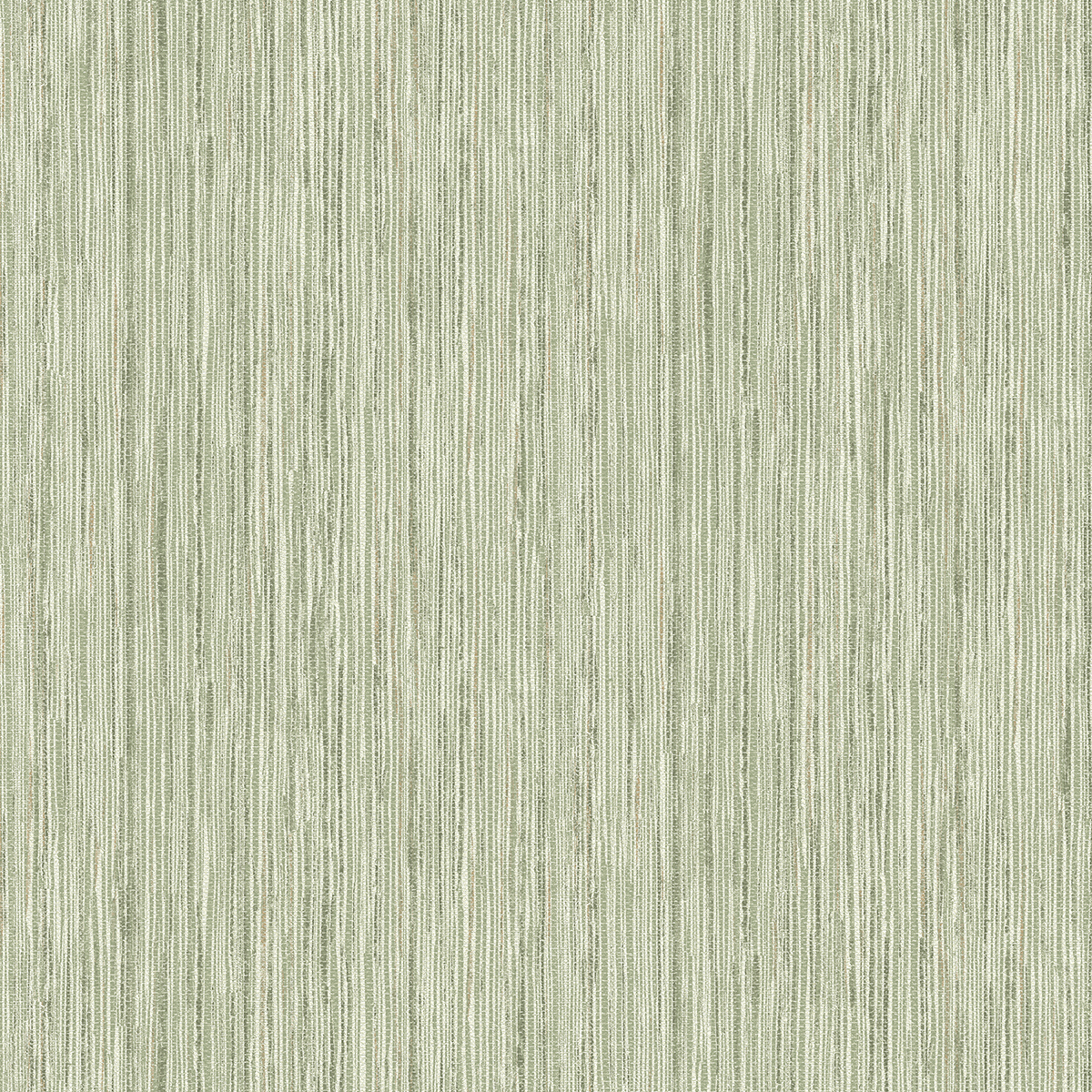 Bring a luxurious and earthen look to your walls with this faux grasscloth design. Vertical strips of cream and sage green, occasionally accented with golden brown, are connected by silver raised ink stitches. Justina is an unpasted, non woven backed vinyl wallpaper.