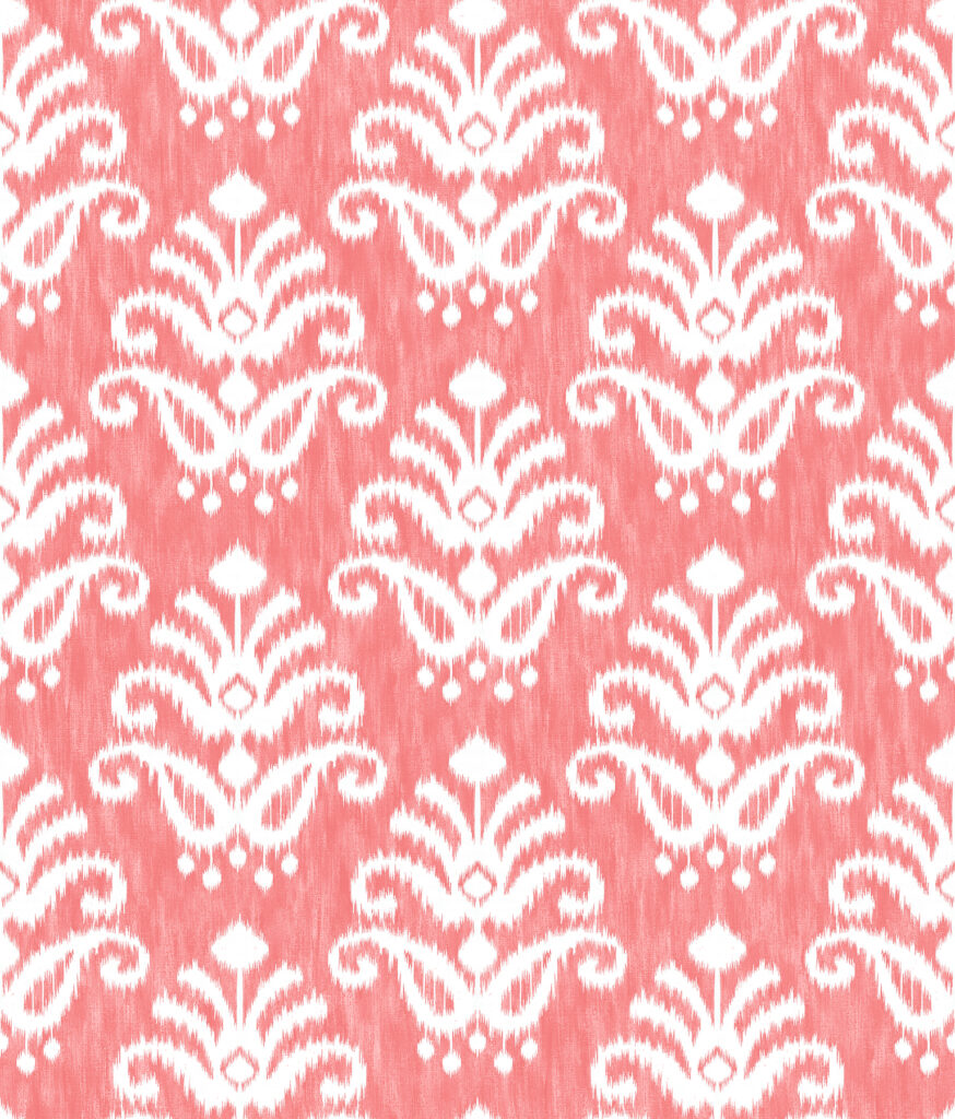 Upbeat and energetic, this chic medallion wallpaper will make a cheerful addition to your walls. The blend of coal-pinks is overlaid with white abstract medallions finished with a jagged, ikat styling. Keaton is an unpasted, non woven wallpaper.