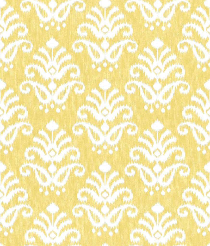 Liven up your space with the sunny hues and upbeat energy of this medallion design. The white, abstracted form is given a jagged ikat finish that coordinates with the variegated blending of yellow in the background. Keaton is an unpasted, non woven wallpaper.