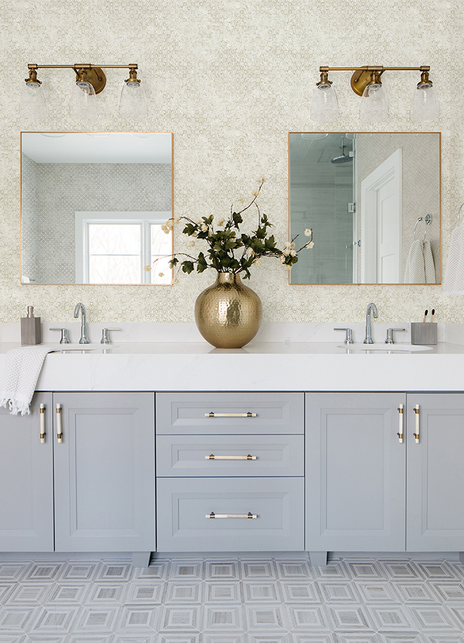This geometric wallpaper fuses old world craftsmanship with modern luxury. The floral mosaic is reminiscent of tiling, but shaped instead with raised metallic gold inks against a creamy white backdrop. Khauta is an unpasted, non woven wallpaper.