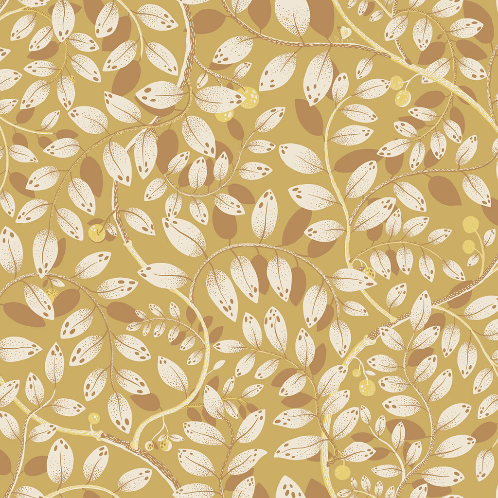 Celebrate the golden days of summer with this charming botanical wallpaper! Leafy white vines wind against a golden ochre backdrop, the leaves hiding petite moths and golden yellow cherries. Kirke is an unpasted, non woven wallpaper.