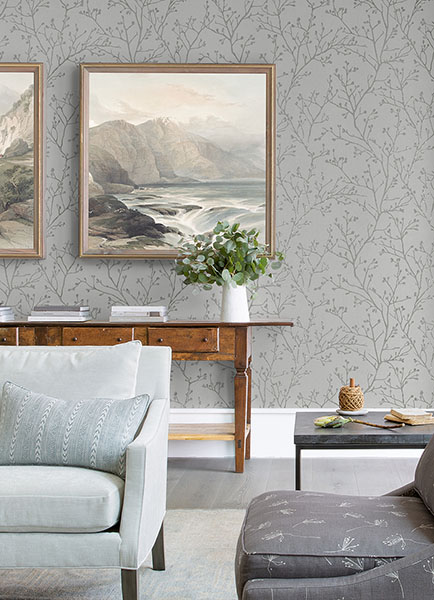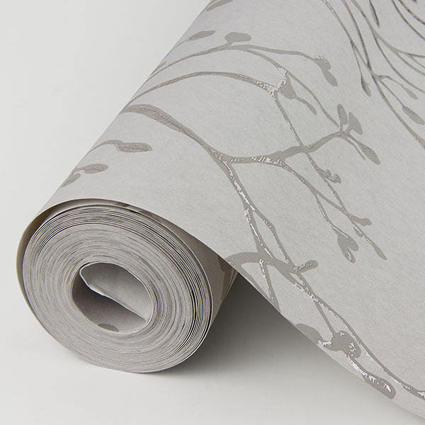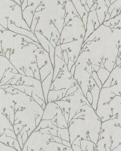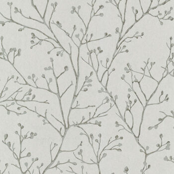 Bring simple sophistication to your home with this stunning botanical wallpaper. The thin grey branches are highlighted with metallic silver, the light taupe-grey background given depth with delicate textural detailing. Koura is an unpasted, non woven wallpaper.