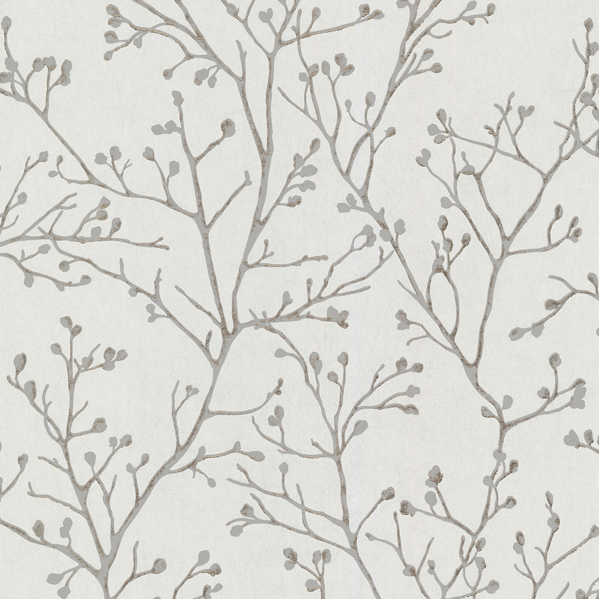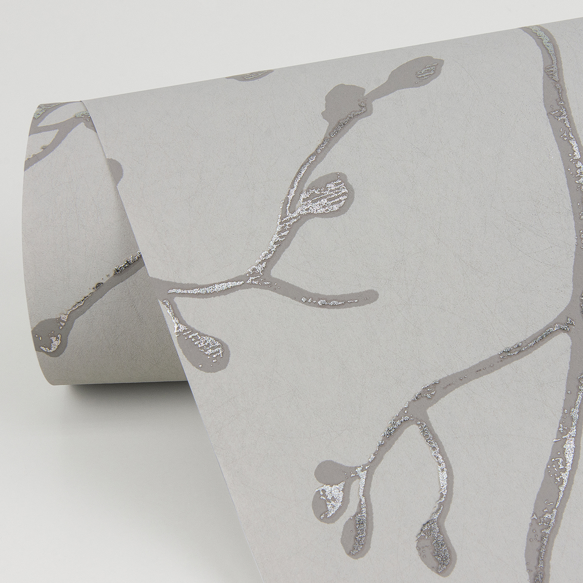 This delicate botanical design brings classic elegance to your home. A light grey backdrop is overlaid with spindly grey branches accented with springtime buds and metallic silver highlights. Koura is an unpasted, foil on non woven wallpaper.