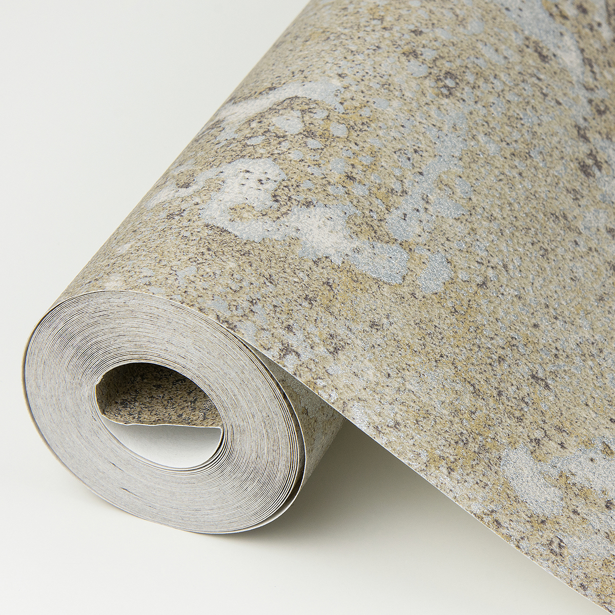 Rough texture and upscale finishes combine to create a dimensional design. The silver and charcoal hues create a cement-like texture that’s accented by splashes of metallic silver. Kulta is an unpasted, non woven wallpaper.