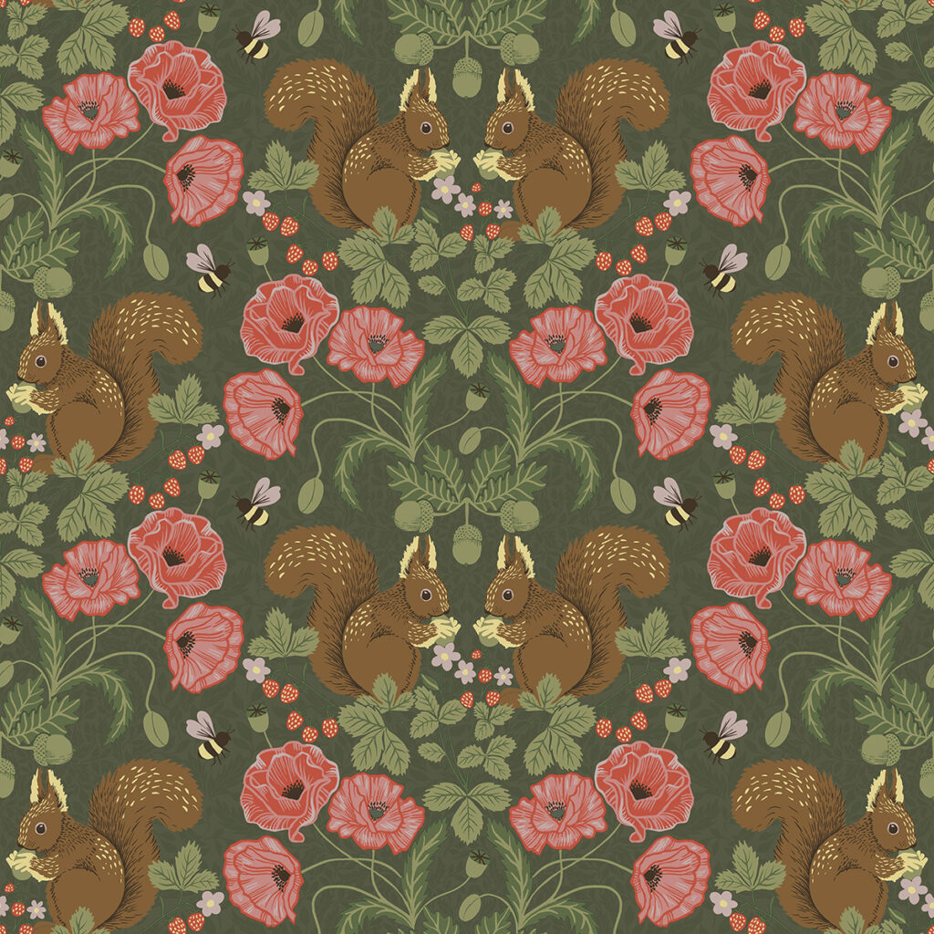 Invite whimsy to your walls with this charming woodland damask! Two squirrels snack on acorns, framed by a ring of pink poppies, strawberries, and bumblebees. The dark green backdrop is subtle imprinted with a pattern of vines and leaves. Kurre is an unpasted, non woven wallpaper.
