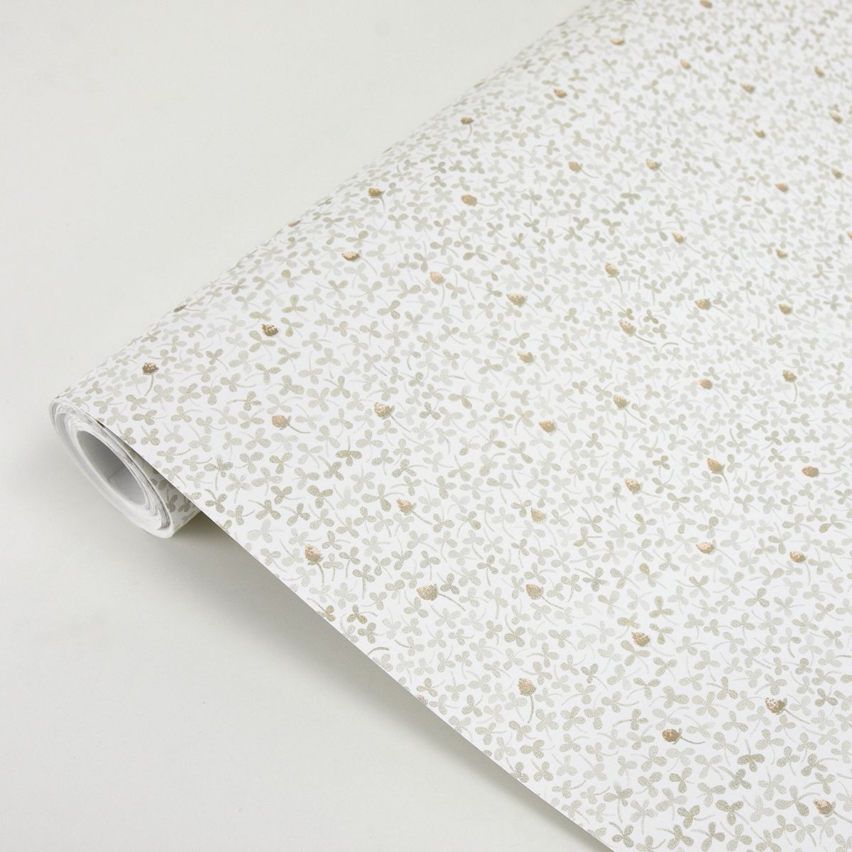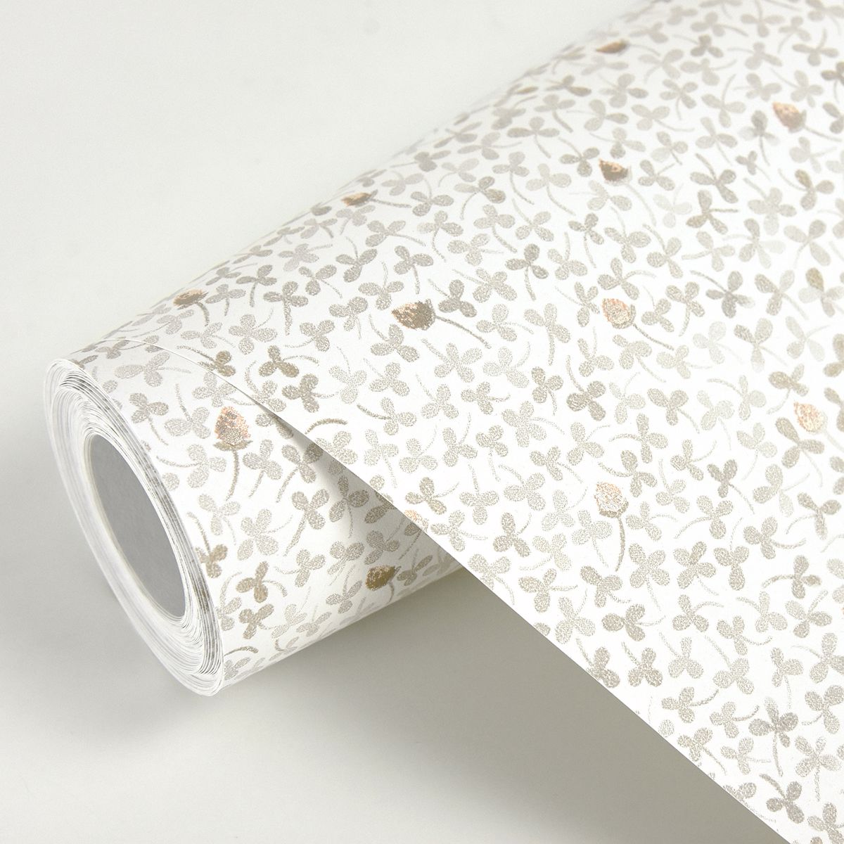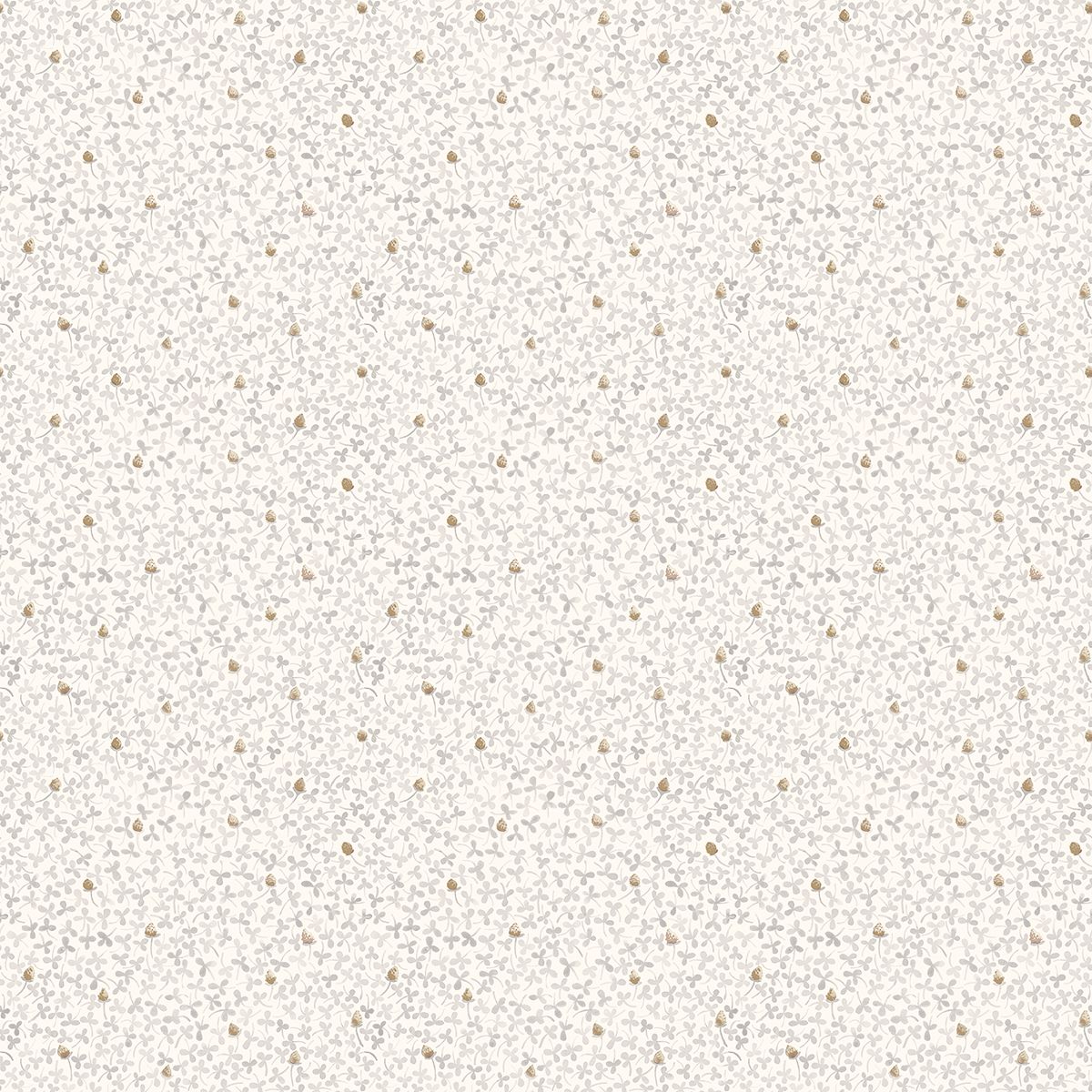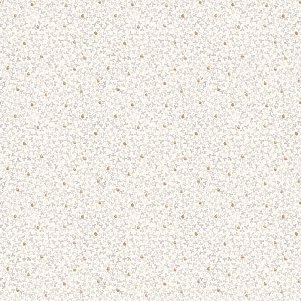 Breathe a fresh energy into rooms with this whimsical wallpaper. Grey miniature clovers frolic about a white background, while gold accents add a touch of glamour to its nature inspired design. Lark is an unpasted, non woven wallpaper.
